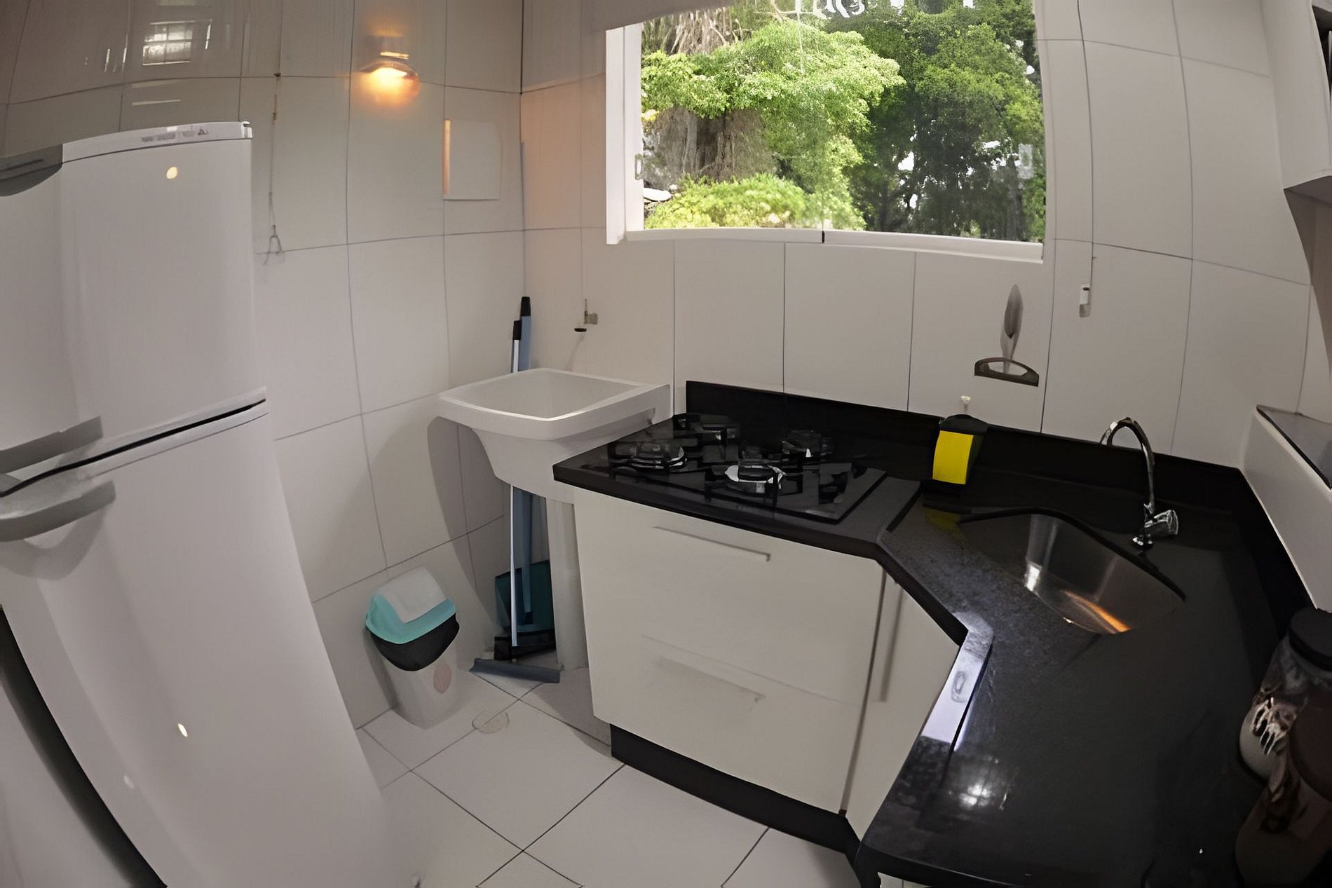 Os quartos apresentam ar-condicionado, TV plana (com canais a cabo), cozinha planejada (com móveis; fogão cooktop; geladeira/frigobar; microondas), utensílios básicos de cozinha, roupa de cama completa e toalha de banho ao seu dispor.