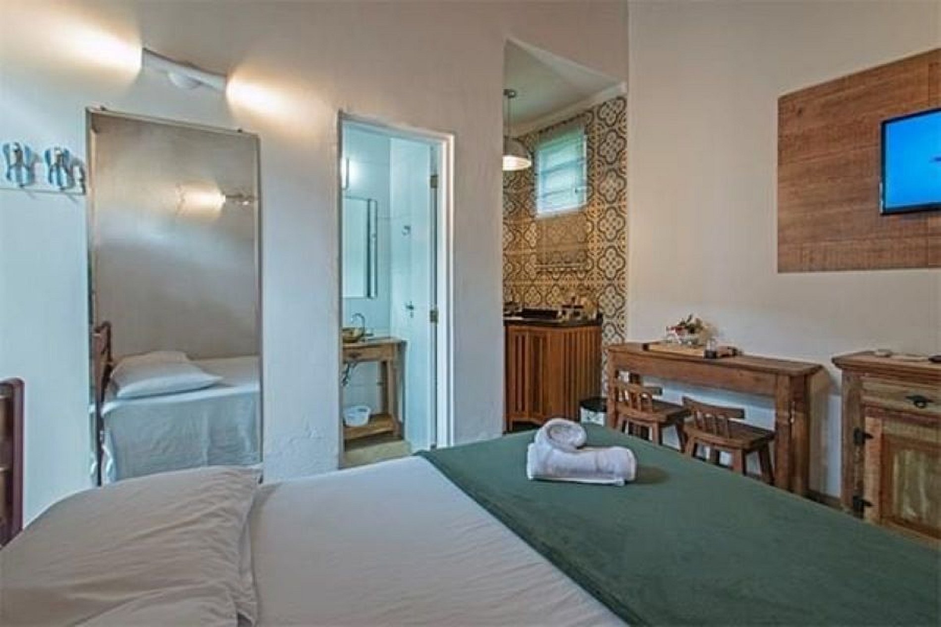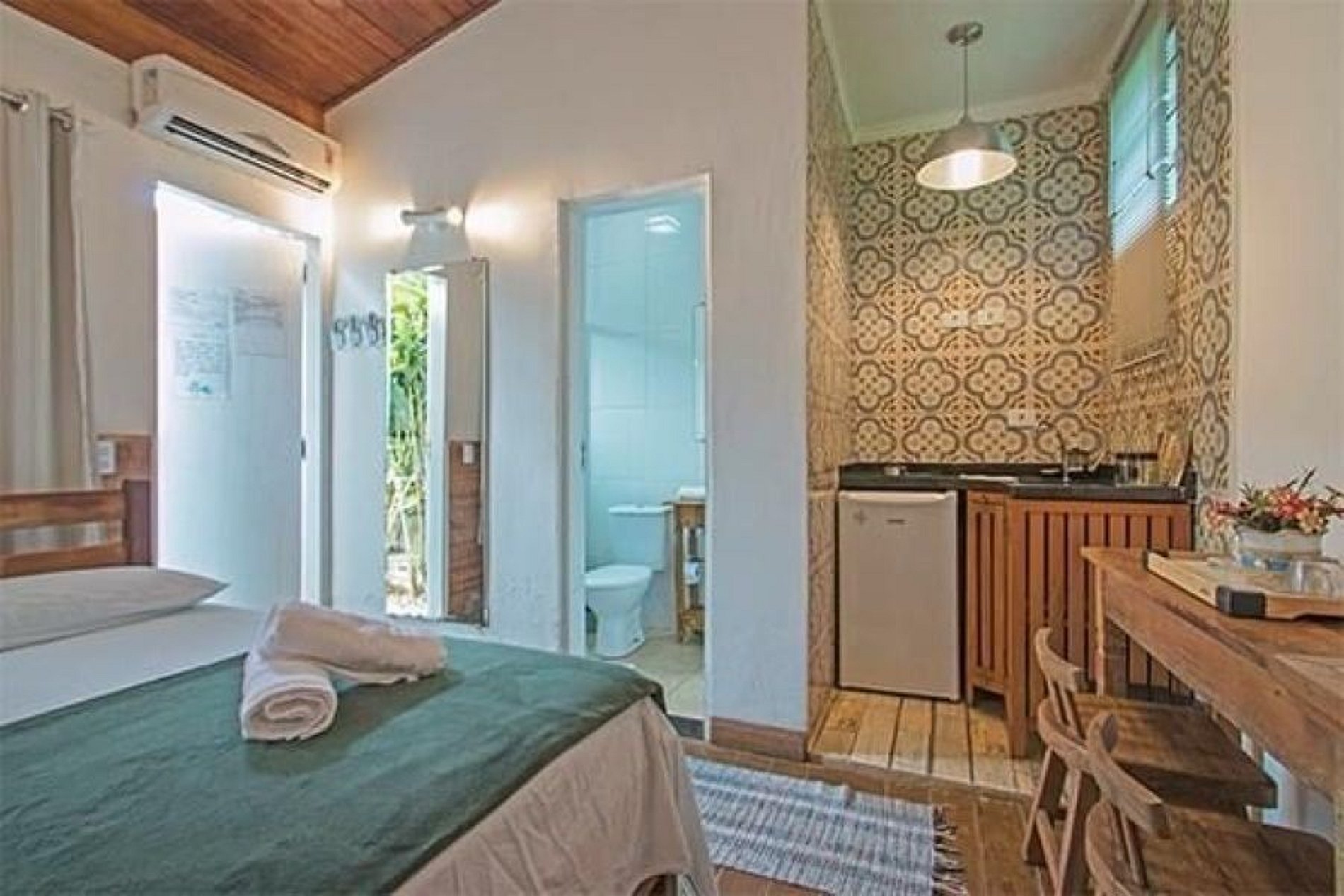 Os quartos apresentam ar-condicionado, TV plana (com canais a cabo), cozinha planejada (com móveis; fogão cooktop; geladeira/frigobar; microondas), utensílios básicos de cozinha, roupa de cama completa e toalha de banho ao seu dispor.